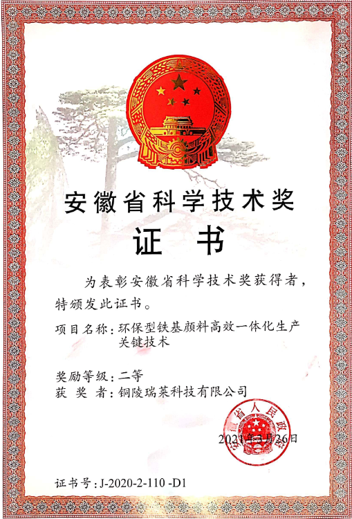 近日,安徽省科技廳發(fā)布了2020年安徽省科學(xué)技術(shù)進(jìn)步獎獲獎名單,重慶公司所屬的銅陵瑞萊科技有限公司報送的《環(huán)保型鐵基顏料高效一體化生產(chǎn)關(guān)鍵技術(shù)》項目榮獲2020年安徽省科技進(jìn)步二等獎。
