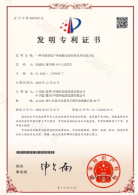 近日,中節能實業發展有限公司下屬嘉興公司自主申報的《一種節能建筑戶外地板安裝結構及其按照方法》的技術成果通過國家知識產權局審查,被授予發明專利權。