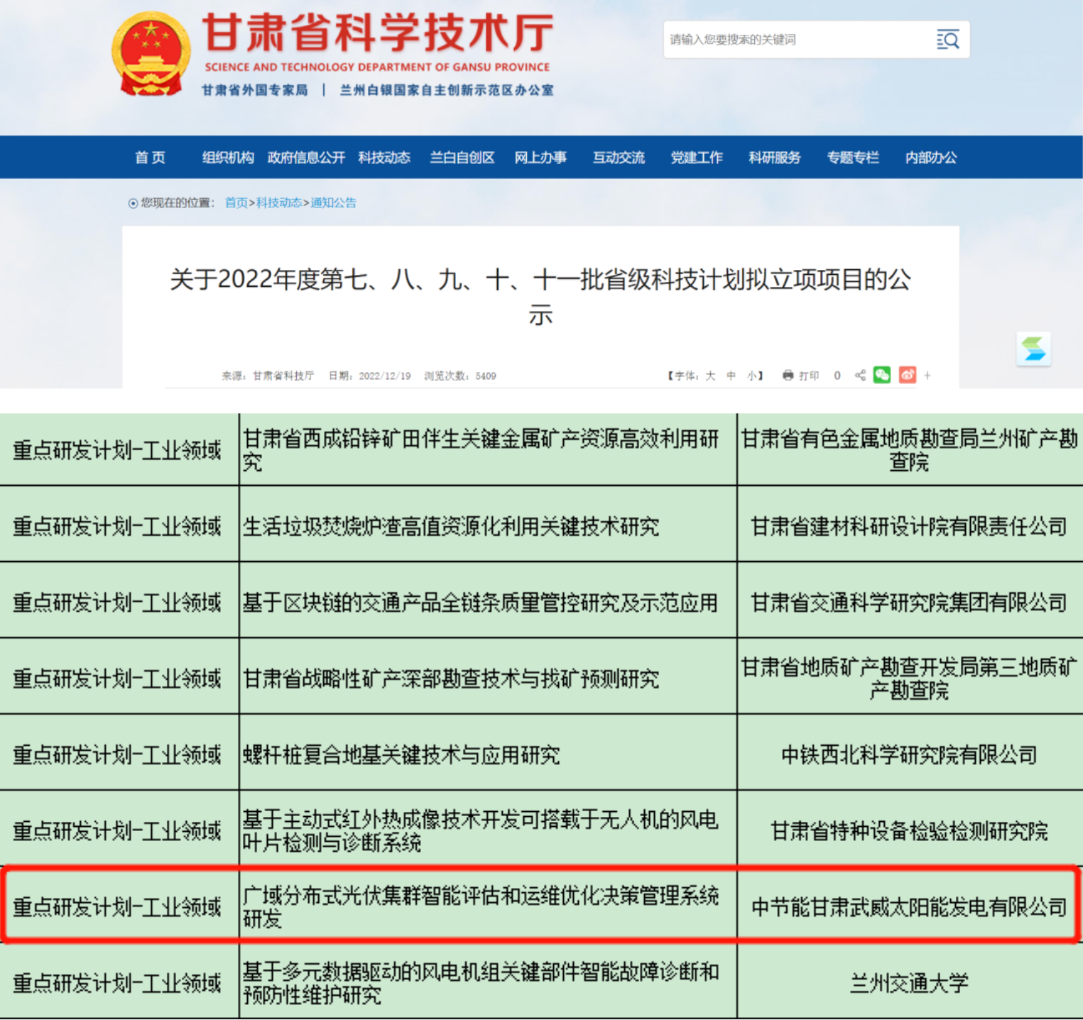 12月19日,甘肅省科技廳發(fā)布了2022年度省級科技計劃立項公示,太陽能公司下屬西北區(qū)武威公司承擔的《廣域分布式光伏集群智能評估和運維優(yōu)化決策管理系統(tǒng)研發(fā)》項目成功入圍,在省級科技項目上實現(xiàn)新突破。