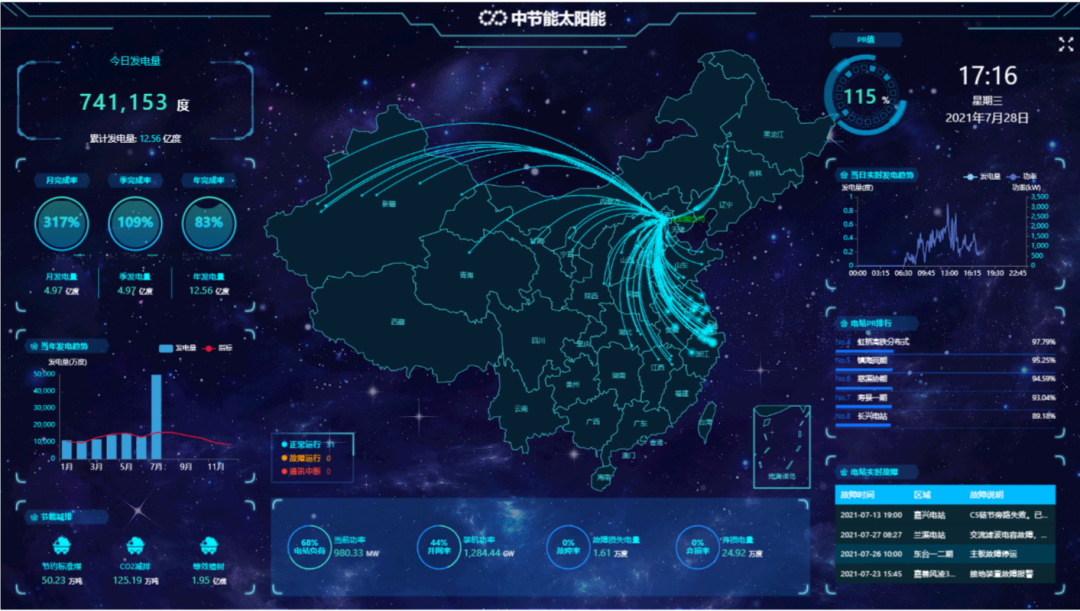 針對分布式電站,“節(jié)能云平臺”可集中調度若干個相鄰電站,通過云平臺實時監(jiān)測每個分布式電站的運營情況,一旦發(fā)生突發(fā)問題,隨時調度附近運維人員及時處理。這對電站人員配置、資源調度都是一大優(yōu)化。