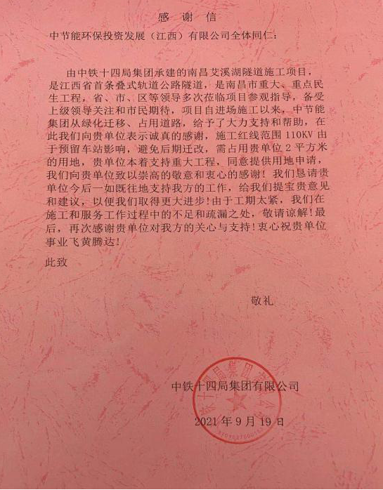 南昌市艾溪湖隧道項(xiàng)目為南昌市重大重點(diǎn)工程,項(xiàng)目正處于緊張的施工階段,由于項(xiàng)目工期緊任務(wù)重,2022年春節(jié)前必須通車,中鐵十四局集團(tuán)有限公司根據(jù)現(xiàn)場(chǎng)情況對(duì)規(guī)劃進(jìn)行臨時(shí)調(diào)整,需占用中節(jié)能國(guó)際中心項(xiàng)目部分紅線內(nèi)用地。江西公司為支持南昌市軌道交通事業(yè)發(fā)展,也為了踐行央企社會(huì)責(zé)任,第一時(shí)間增加總經(jīng)理辦公會(huì)議題,并審議通過(guò)了占地申請(qǐng),以實(shí)際行動(dòng)支持該重大重點(diǎn)民生工程建設(shè)。 錦旗是榮譽(yù),更是責(zé)任。江西公司將繼續(xù)秉承國(guó)有企業(yè)的初心和使命,勇?lián)肫笊鐣?huì)責(zé)任,為助推地方政府綠色發(fā)展,打造美麗中國(guó)“江西樣板”貢獻(xiàn)央企力量。