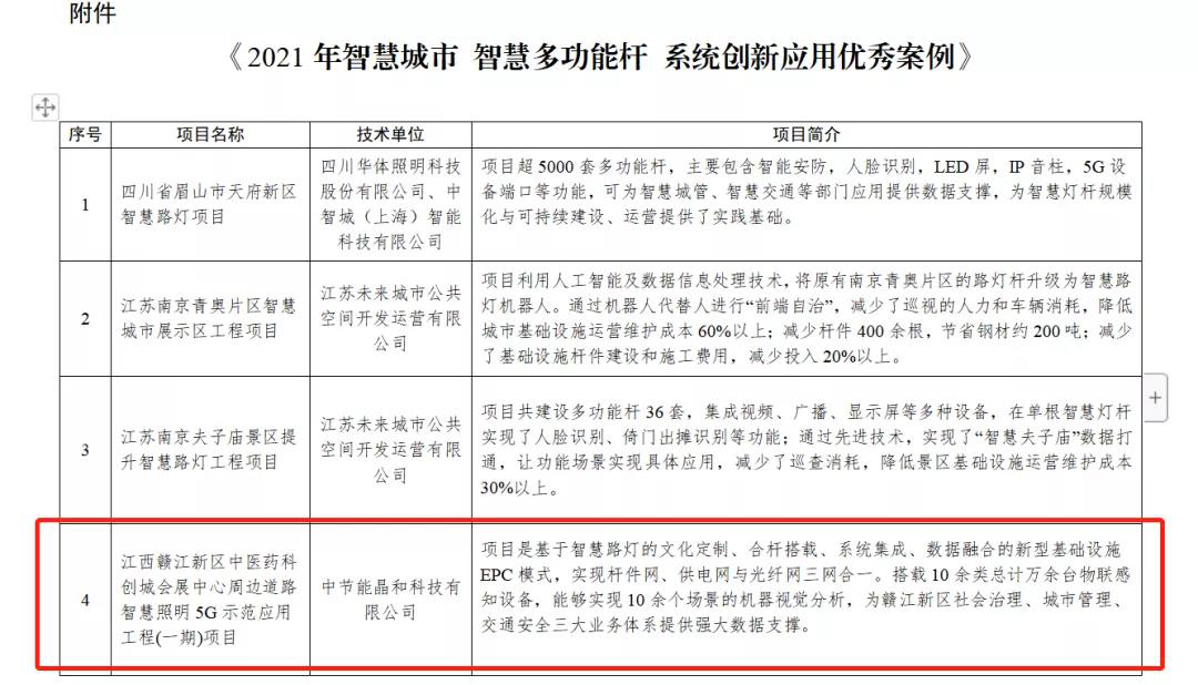 12月8日,國(guó)家節(jié)能中心官網(wǎng)發(fā)布《2021年智慧城市 智慧多功能桿 系統(tǒng)創(chuàng)新應(yīng)用優(yōu)秀案例》,江西公司下屬子公司中節(jié)能晶和科技有限公司“江西省贛江新區(qū)中醫(yī)藥科創(chuàng)城會(huì)展中心周邊道路智慧照明5G示范應(yīng)用工程(一期)項(xiàng)目”,經(jīng)國(guó)家節(jié)能中心專(zhuān)家評(píng)價(jià)篩選,結(jié)合實(shí)地考察結(jié)果,專(zhuān)家組終審確認(rèn)成功入選。此次國(guó)家節(jié)能中心經(jīng)過(guò)現(xiàn)場(chǎng)核實(shí)、情況復(fù)查、信譽(yù)核查及公示等環(huán)節(jié)僅評(píng)選出10個(gè)符合標(biāo)準(zhǔn)的優(yōu)秀案例。