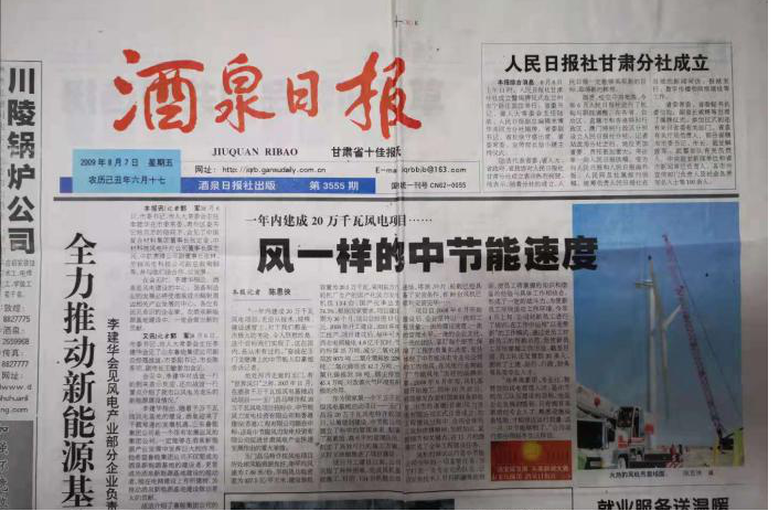 2009年8月8日,國家能源局、甘肅省人民政府在中國節(jié)能玉門昌馬風(fēng)電場舉行國家千萬千瓦級風(fēng)電基地一期工程開工儀式,標(biāo)志著倍受社會高度關(guān)注、我國自主規(guī)劃設(shè)計建設(shè)、世界上規(guī)模最大的風(fēng)電工程全面實施,甘肅省發(fā)展新能源、應(yīng)對新氣候變化進(jìn)入新階段,“陸上三峽”揚(yáng)帆起航。