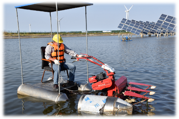 繁忙的工作反而促使了思想的迸發。劉加勇在工作中遇到困難總會思考更為先進的工作方式。水面上的雜草為檢修工作帶來了不小的麻煩、每一塊板子維修更換又異常繁雜,如何更加便捷安全地進行維修更換、提高工作效率成了劉加勇的一個“心病”。工作中的挑戰轉化為思維的火花,迸發出勞動的激情。劉加勇帶領團隊成功研制了“一種太陽能組件跟蹤支架吊裝工具”和“一種太陽能組件跟蹤支架支撐工具”用于主軸更換時支撐農門架,解決了運維時的效率低下問題;“一種水上打草機”能夠以快捷,高效的方式清潔水面,大大減少了電站兩千六百畝的海面除草時間;“一種太陽能光伏組件驅鳥裝置”防止了海鳥對發電設備的侵擾,保障了光伏板的安全性和發電效率。在原有“一種水上打草機”的基礎上,劉加勇進一步改良,又申請了“一種載人水上打草機”專利,目前這幾項工具均獲得了國家級的實用新型專利授權。