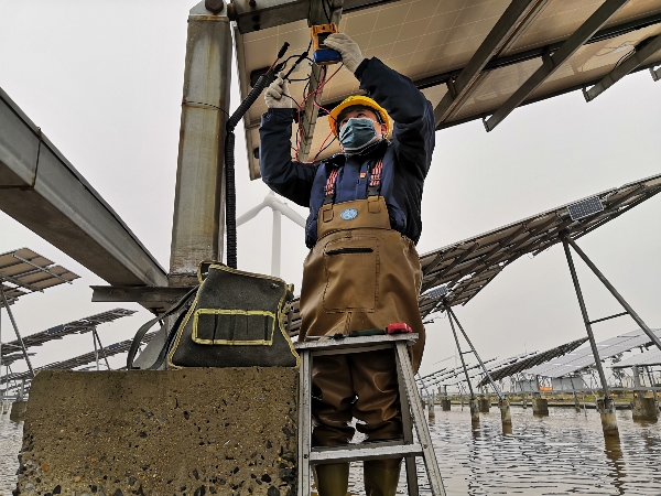 太陽能華東區東臺電站坐落于黃海之濱,三十五萬塊太陽能電池板占據了這兩千六百畝的海面,彷如海岸邊的“書頁”,記錄著這座電站的事和人。而它們的“第一頁”記載著一名叫做劉加勇的漢子。