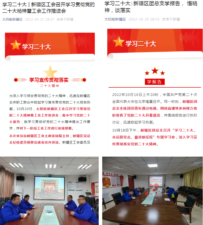 黨的二十大勝利召開以來,太陽能新疆區(qū)黨總支切實把思想和行動統(tǒng)一到黨的二十大決策部署上來,迅速掀起學習宣傳貫徹熱潮,堅持把“為何學、怎么學、怎么做”貫穿到新疆區(qū)工作的各方面、全過程,通過領導干部帶頭學、層層發(fā)動廣泛學、豐富載體創(chuàng)新學、結合實踐深入學,做到學思用貫通、知信行統(tǒng)一,以實干實績檢驗學習貫徹成效。