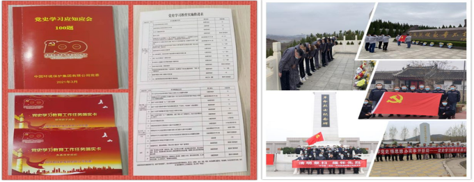 中國(guó)環(huán)保黨委深入貫徹落實(shí)集團(tuán)公司黨委部署要求,組織各基層黨組織積極做好再部署、再動(dòng)員,采取多種形式,掀起學(xué)習(xí)熱潮,高標(biāo)準(zhǔn)推進(jìn)黨史學(xué)習(xí)教育落實(shí)落地。一是把規(guī)定動(dòng)作做實(shí)。下屬棲霞公司黨支部通過(guò)開(kāi)展“四個(gè)一”系列活動(dòng),列明9項(xiàng)規(guī)定動(dòng)作,推動(dòng)黨史學(xué)習(xí)教育走深走實(shí)。淶水公司黨支部制定“一月一專(zhuān)題”學(xué)習(xí)計(jì)劃表,將12個(gè)研討專(zhuān)題逐月推進(jìn),滄州公司黨支部開(kāi)展每日一讀、每周一課、每月一測(cè)的“1+1+1”黨史學(xué)習(xí)教育;萍鄉(xiāng)公司黨支部采取“參觀見(jiàn)學(xué)、領(lǐng)導(dǎo)帶學(xué)、視頻看學(xué)、網(wǎng)絡(luò)助學(xué)、結(jié)隊(duì)幫學(xué)”五學(xué)模式,抓好基層黨員黨史學(xué)習(xí)教育。二是把自選動(dòng)作做活。保定公司黨支部推出每周紅色觀影、“黨史百年”詩(shī)詞朗誦、紅歌合唱等活動(dòng);山東公司黨支部依托當(dāng)?shù)丶t色教育資源,組織開(kāi)展實(shí)踐教學(xué)活動(dòng),煙臺(tái)公司和潤(rùn)達(dá)公司黨支部聯(lián)合開(kāi)展“憶黨史、銘黨恩、促黨建”跟著視頻學(xué)黨史活動(dòng);合肥公司黨支部組織開(kāi)展“學(xué)黨史勵(lì)初心 開(kāi)奮斗新征程”黨史知識(shí)競(jìng)賽,教育引導(dǎo)廣大黨員學(xué)透歷史、學(xué)深思想、學(xué)出成效。三是把各環(huán)節(jié)工作做精。公司黨委緊密結(jié)合方案要求,為領(lǐng)導(dǎo)班子成員和各基層黨組織“量身定制”《黨史學(xué)習(xí)教育工作任務(wù)落實(shí)卡》,以項(xiàng)目化、清單化、責(zé)任化的方式,既明確“規(guī)定動(dòng)作”內(nèi)容,又為“自選動(dòng)作”指明方向。同時(shí)編印《黨史學(xué)習(xí)應(yīng)知應(yīng)會(huì)100題》口袋手冊(cè),以知識(shí)題庫(kù)的形式分享黨史知識(shí),推動(dòng)黨史學(xué)習(xí)教育精細(xì)化、規(guī)范化。