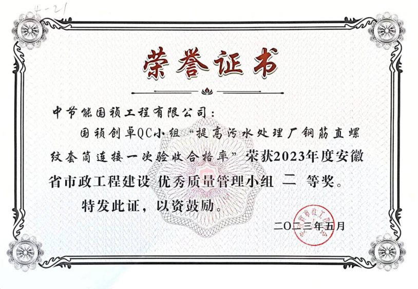 中節能國禎工程公司QC小組編寫的《提高污水處理廠鋼筋直螺紋套筒連接一次驗收合格率》憑借圖文并茂、邏輯性強的特點,在眾多成果中脫穎而出,獲“優秀質量管理小組二等獎的優異成績這也是工程公司首次取得該項榮譽